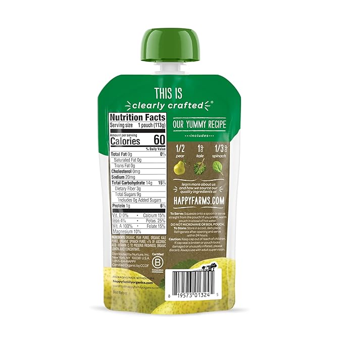 Happy Baby Organics Stage 2 Baby Food Pouches, Gluten Free, Vegan & Healthy Snack, Clearly Crafted Fruit & Veggie Puree, Pears, Kale & Spinach, 4 Ounces (Pack of 16)