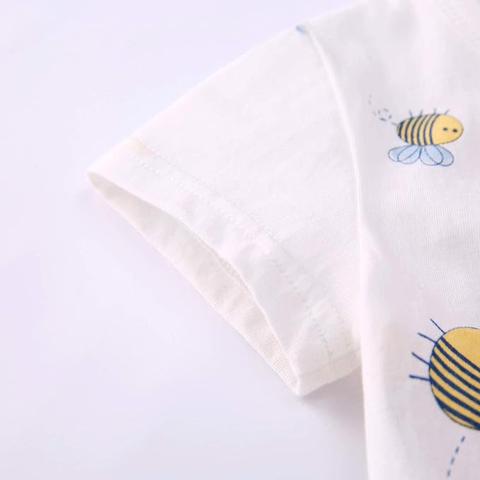 • Made in soft and comfy natural cotton, making it a light and breezy choice for summer vacations. Features allover cartoon bees printing, short sleeve, snap buttons at shoulders for easy dressing