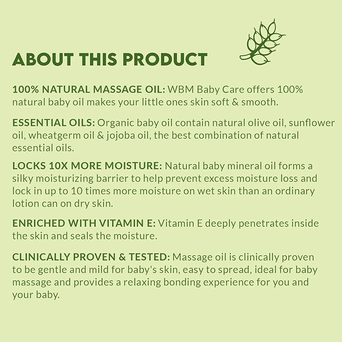 • Mother’s favorite: WBM Baby Oil is the young mom’s top choice for caring for your little one’s skin. Trust our baby oil for gentle, nourishing baby oil care.