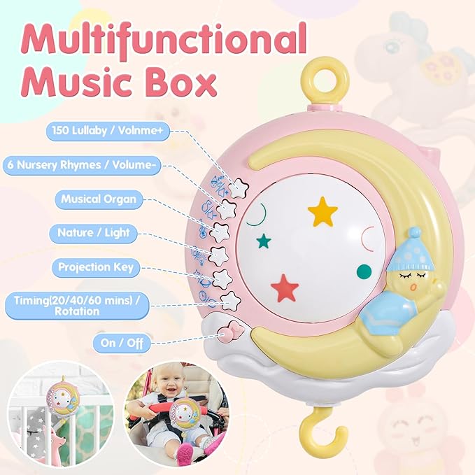 • [Take Along Baby Girl Mobile & Rattles]--Music box have sticky fastener design, can be carried alone or tied to the arm of the bed. Use on cribs, play yards, carriers, strollers, bassinets and more. 4 pendant can be taken off as small rattle toys.