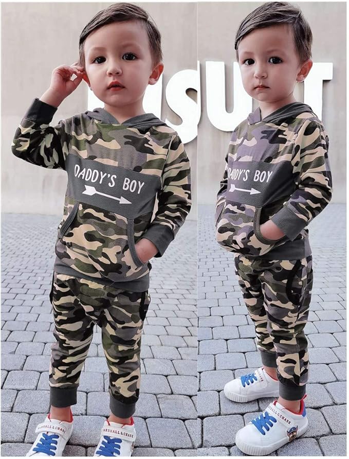 • Cute Baby Boy Outfit--Camo baby outfit features big pocket at front, long sleeve hooded sweatshirt with matching camouflage hunting pants, cute letter prints "Daddys Boy" baby clothes will make your little boy look very attractive and fashion when wear it