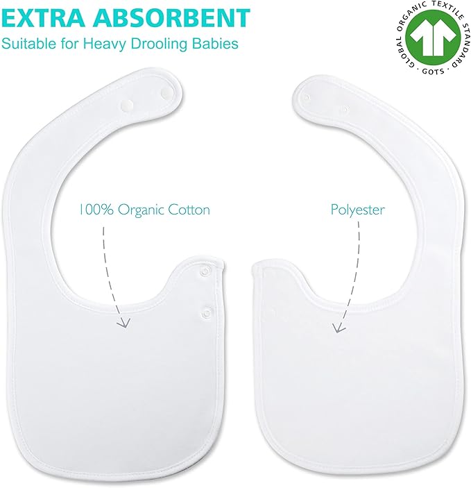 • 【SUPER SOFT AND ABSORBENT DROOL BIBS ORGANIC COTTON】Soft enough to help keep baby’s tender skin dry and rash-free.Dual-layer design bibs, the front layer is made of organic cotton with high absorption capacity and the back is a polyester fleece that prevents the drools from soaking the baby’s clothing.