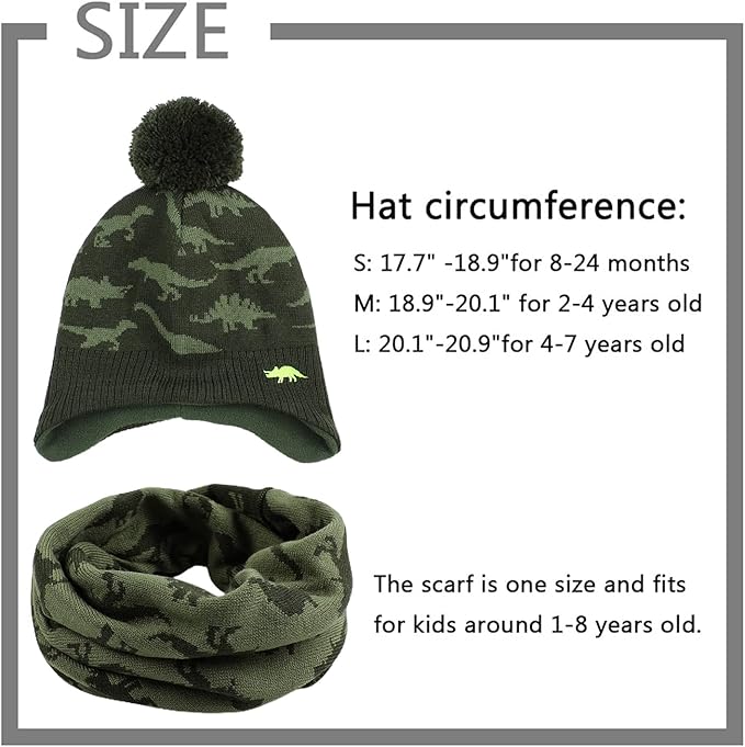 • SIZE INFORMATION:This baby hat is available in THREE different sizes suitable for babies, toddlers, and kids. The circumference of the hat varies depending on the size: 17.7' -18.9'(S) for babies aged 8-24 months, 18.9'-20.1'(M) for children aged 2-4 years old, and 20.1'-20.9'(L) for kids aged 4-8 years old. The scarf is one size and can fit kids between the ages of 1-8 years old.