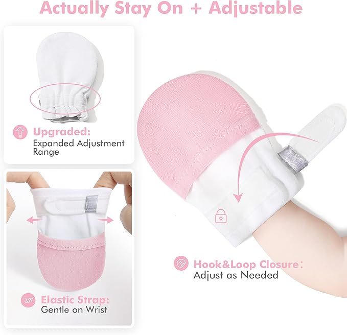 HAPIU Baby No Scratch Mittens Stay On, 100% Cotton Breathable, Adjustable Infant Gloves for Boys Girls, Newborn - 12 M