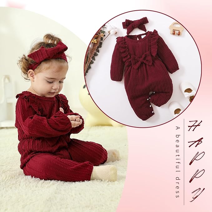 Happy Town Baby Girl Romper Infant Fall Winter Clothes Ruffle Sweater Long Sleeve Bodysuit Jumpsuit and Headband