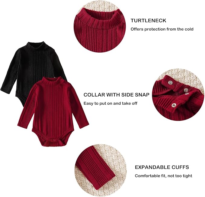 DEFAHN Baby Turtleneck Bodysuit Long Sleeve Boy Girl Ribbed Knit Jumpsuit Outfit 2 Pack Baby Solid Onsies 0-24 Months