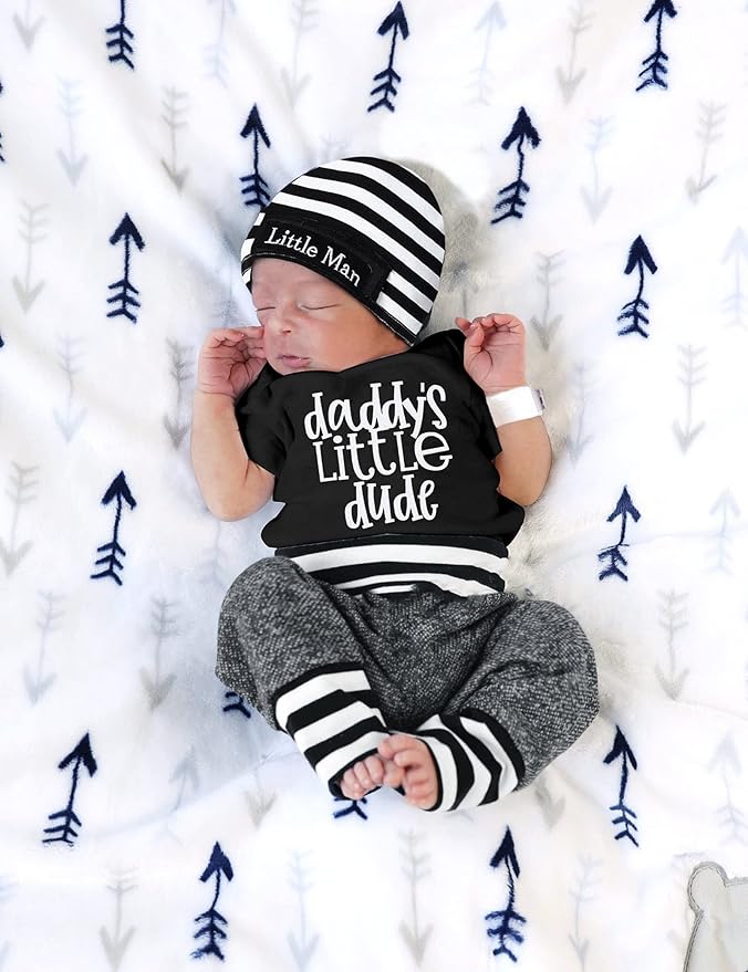 • 👼【Unique Design】Fashion Cute Baby Boy Outfits with letters print design: New to the Crew, Little Brother, Mamas Boy, Daddys Little Dude, Cooler Version of Dad, unique and fun. Classic round neck romper, striped patchwork Pants, little man hat, this Infant Boy Clothes 3PCS Set will keep your baby comfortable and handsome all seasons