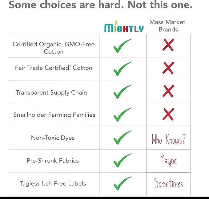 • 100% ORGANIC COTTON - Mightly children’s clothes are certified to the Global Organic Textile Standard (GOTS). They are imported from India and made with certified organic cotton and non-toxic dyes and inks. Our dye process results in long-lasting color that won't irritate sensitive skin. Mightly’s GOTS ID# is OT-034929.