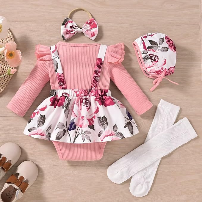• ❤[Super Cute Outfit] Solid ribbed ruffle romper with floral suspender overalls dress design with unique matching headband.A adorable outfit the recipient was very pleased to have gotten for her new baby daughters layette