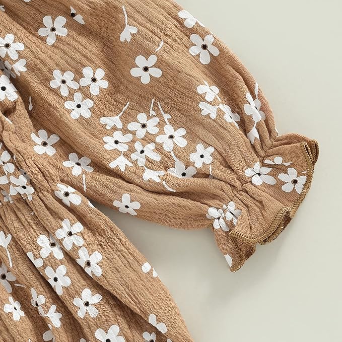 • Design: Baby girl autumn casual romper dress, long sleeve, off shoulder, daisy floral print,baby girl long sleeve one-piece daisy print ruffle short sleeve ruched romper onesie jumpsuit bodysuit, elastic waist jumpsuit romper dress for baby girl, bowknot hairband, bow decor on the waist, snap closure at the crotch, very loose fit and skin-friendly.