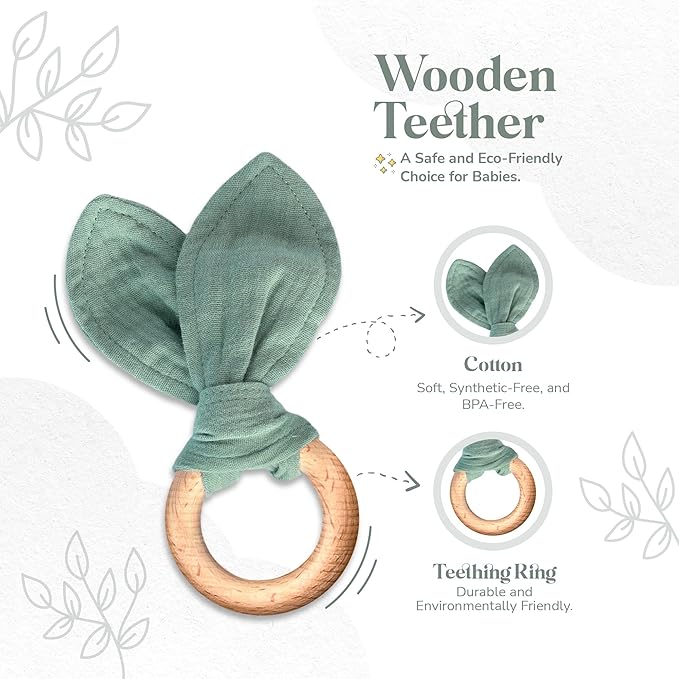 • [FOR LITTLE EXPLORERS]- The long bunny ears of the breathable lovey and its carefully sewn cloth ends are perfect for grabbing and playing. The teething ring made of untreated wood with matching rabbit ears is ideal for biting and suckling.