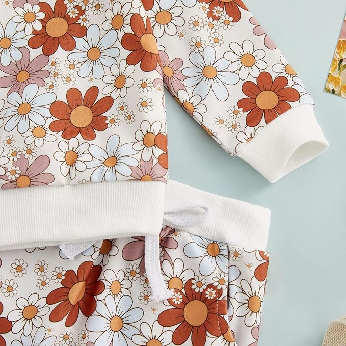 • 🏵️ Features: Daisy floral print long sleeve crewneck pullover shirt and stretchy pockets legging sweat pants matching with bow headbands, baby girl fall clothes