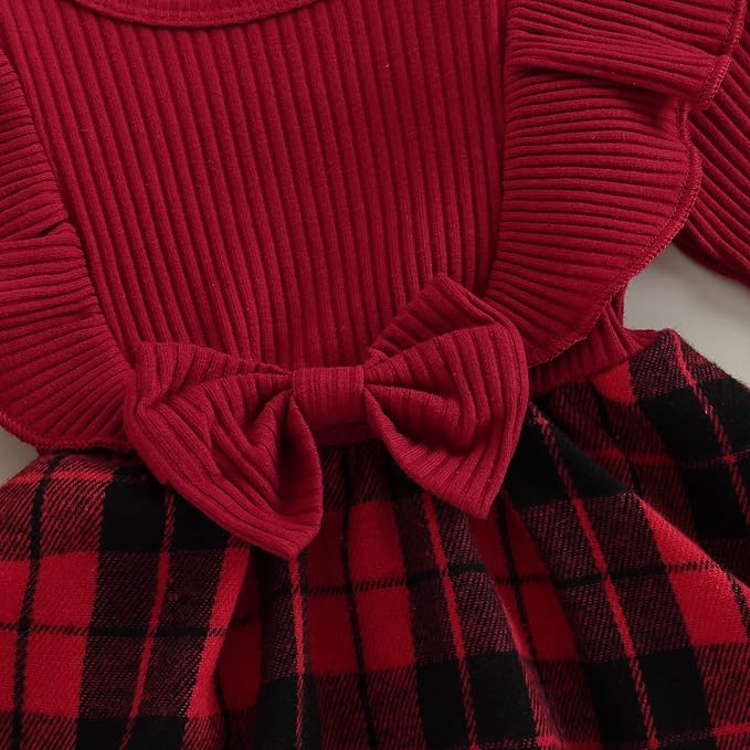 Hnyenmcko Newborn Baby Girl Christmas Clothes Infant Red Plaid Romper Dress Ruffle Long Sleeve Ribbed Bodysuit Headband Set