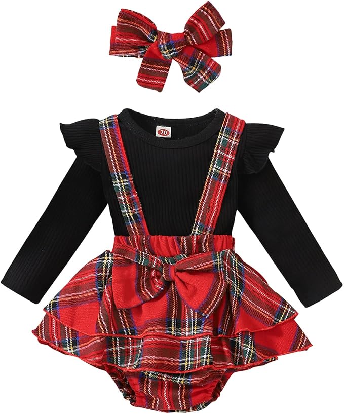 • Design--- Infant baby girl Christmas romper, Ruffle long sleeve, red plaid, crewneck ribbed knit romper, cute bowknot, suspender bodysuit with elastic waistband, snap closure, easy to put on/take off and change diapers, newborn girl christmas romper dress, with bow headband, Make your baby more attractive and fashionable.