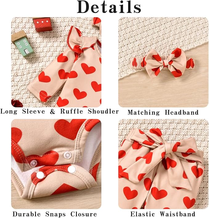 • PREMIUM COTTON MATERIAL : Crafted in soft ribbed cotton blend material, high absorbent and breathable, cozy feel of this baby clothing to keep little baby warm and comfy all spring, autumn & winter. Are you ready to wrap your little princess up in this cute baby girl Valentines day pants set?