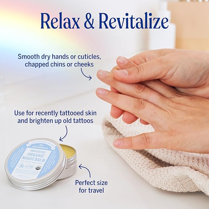 • DR. BRONNER’S ORGANIC MAGIC BALM IS VERSATILE: Our balm is a multifunctional product—like most of our products! It can be used to heal dry hands, face, body, cuticles, chins & cheeks. Apply to chafed skin where needed & get relief.