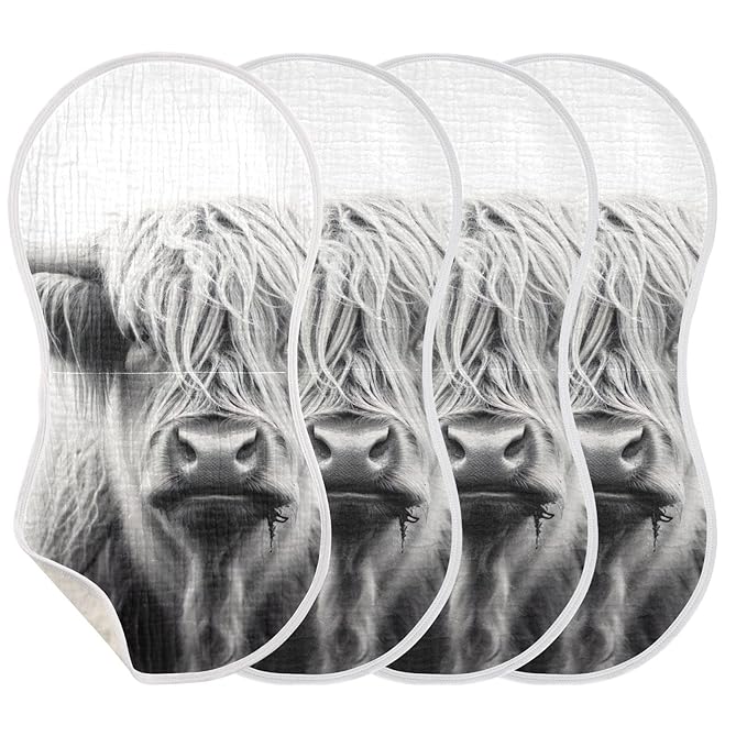 Muslin Baby Burp Cloths Set of 4, Soft Absorbent Highland Cow Muslin Washcloths, Bibs, Face Towel for Newborn Boys Girls, 22 x 11 Inch