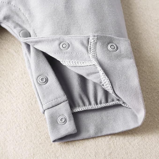 • Design: The button behind the collar is easy to put on and take off. Snap button on the bottom of the one-piece rompers are easier to wear and change diapers.