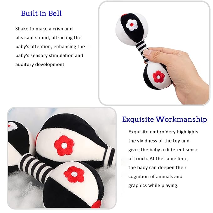 • 2 PCS Baby Rattles: Soft baby rattle toys are loud and super easy for little hands to grasp,grabing newer baby s attention.Black and white graphics contrast keep baby's attention.