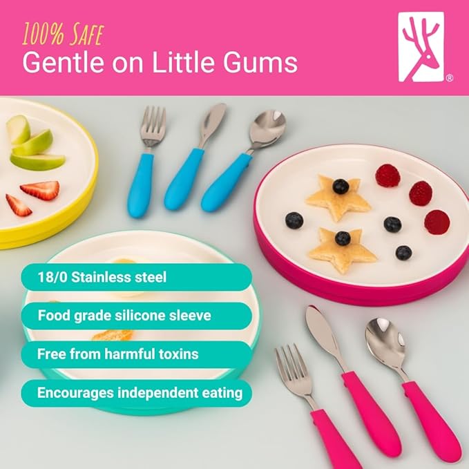 • SILICONE HANDLE: The Elk and Friends spoon, fork and knife feature a stainless steel tip and a easy to grip ergonomic anti-slip silicone handle making it easy for small hands to hold.