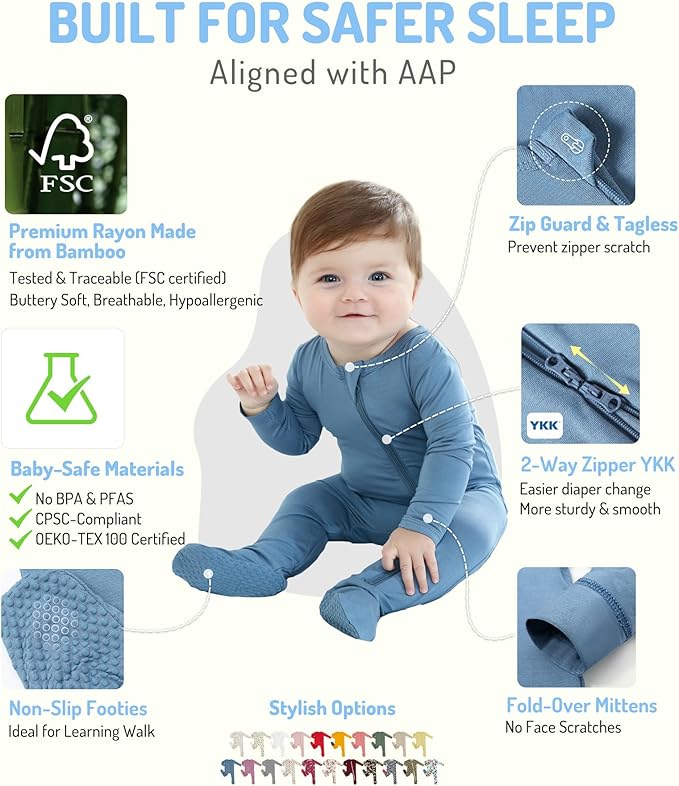 • 【Safe and Certified】This Rayon Made from Bamboo baby pajamas s is designed with love. Safe fabrics tested against 1,000+ substances for highest standards. Zip Guard at neck and Zipper Garage protect chin and skin. No Flame Retardants.