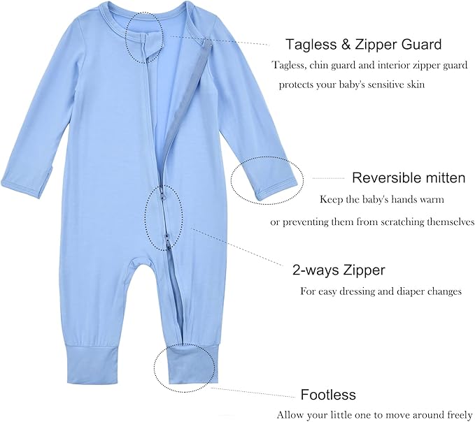 • Double Zipper Closure -2-Way zipper design that makes diaper changes a breeze, easy on and off. Neck tag and and inner zipper protective tab protect your baby's gentle skin.