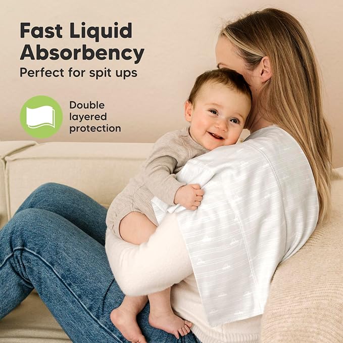 • Super Absorbent, Catches Liquid Well - These burping cloths for babies sits on your shoulder comfortably, and the thick organic cotton catches rolling liquid and spit ups well.