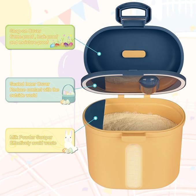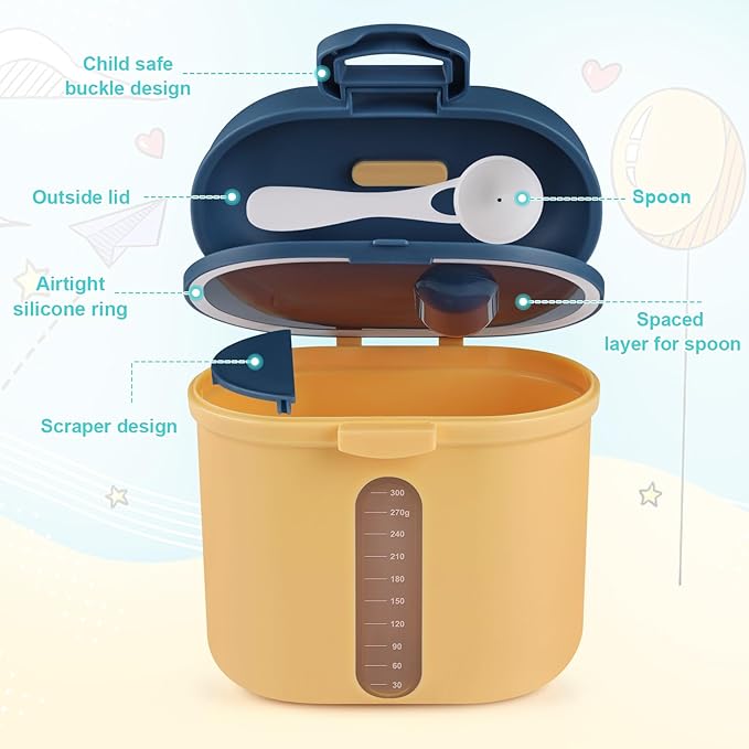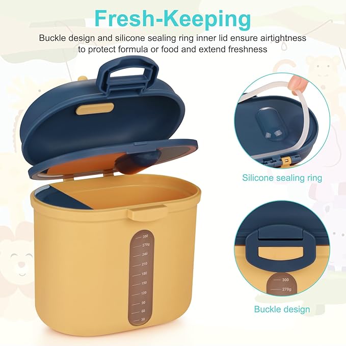 • Sealed Milk Powder Container - Inner lid attach silicone sealing ring , the outside lid have buckle design, there are double barrier to ensure the freshness of milk powder and food.