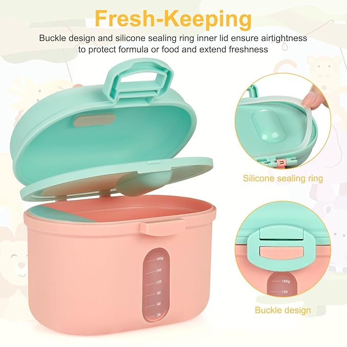 • Sealed Milk Powder Container - Inner lid attach silicone sealing ring , the outside lid have buckle design, there are double barrier to ensure the freshness of milk powder and food.