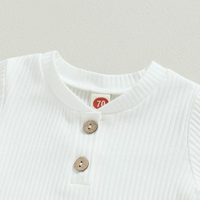 • Design: Neutral baby clothes. Solid color/ striped, v-neck and button design, snap closure for easier changing diapers, knit ribbed long sleeve romper top matching with solid elastic waistband drawstring long pants. Simple yet stylish. Perfect for spring/fall/winter.