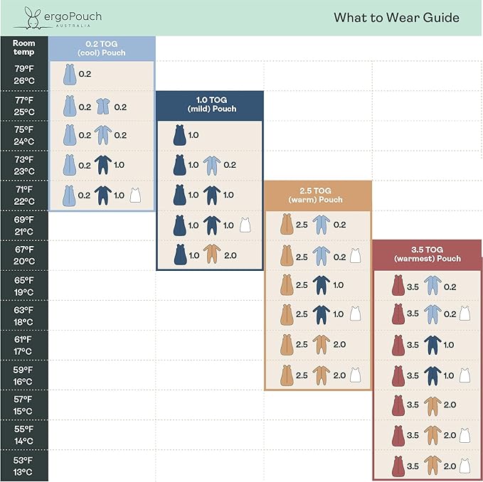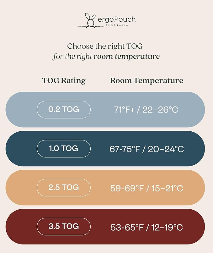 • Choose the Right TOG for Safe Sleep: Temperature-matched for year-round comfort with 4 TOG ratings (warmth levels): 0.2 TOG (71 °F +/ 22 °C +), 1.0 TOG (67–75 °F / 20–24 °C), 2.5 TOG (59–69 °F / 16–21°C), and 3.5 TOG (53–65 °F / 13–19 °C). Eliminates loose blankets while maintaining the temperature for safe sleep. Refer to our What to wear guide for safe dressing options.