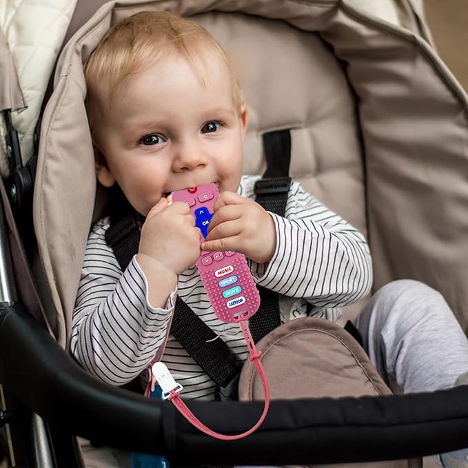 • 【Food-Grade Silicone,Safe for Chewing】Our cute remote baby teething toys are made of 100% BPA-free, non-toxic silicone, they are completely safe for infants, toddlers and newborns,suit for babies from 0-18 months,parents do not worry about any harmful substances entering their mouths as babies gnaw, bite, or chew . Soft yet durable texture soothes sore gums during teething.