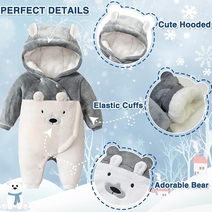 • 【Powerful Warmth】 The newborn winter hoodie jumpsuit design, keeps the baby’s head and ears warm when outing. Snaps design, easy for dressing, keep baby away from cold wind, perfect for cold winter. It is the best gift for your baby this winter.