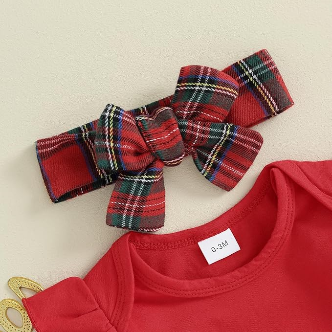 Hnyenmcko Newborn Baby Girl Christmas Clothes Infant Red Plaid Romper Dress Ruffle Long Sleeve Ribbed Bodysuit Headband Set