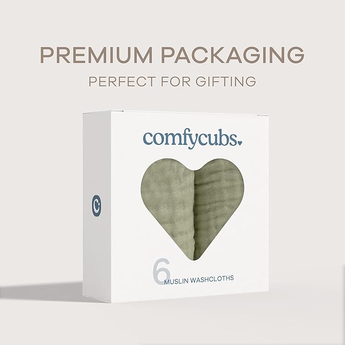 Comfy Cubs Muslin Baby Washcloths 6 Pack - Soft 6-Layer Cotton Wash Cloths for Sensitive Skin - 10"x10" Large, Gentle, Absorbent Infant Essentials for Newborn and Toddlers - Sage
