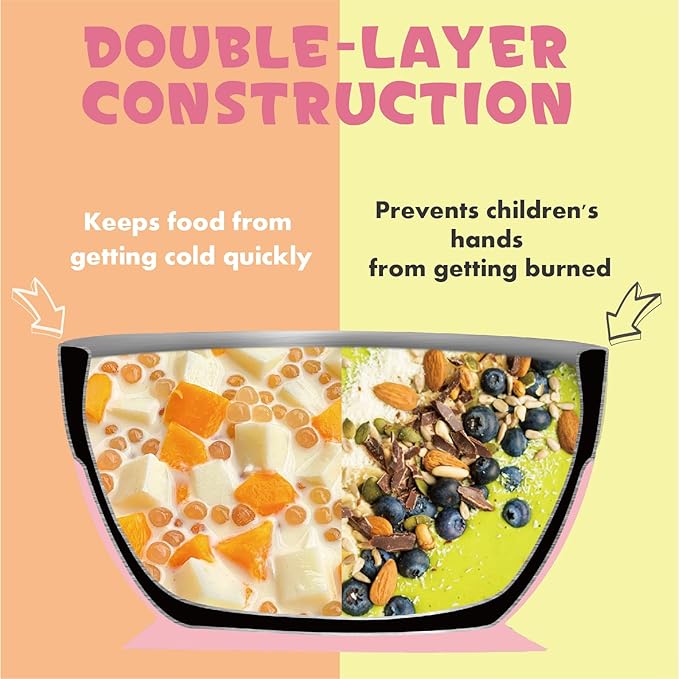 • Double-Wall Insulation for Safe, Ideal Temperatures: Crafted from premium, durable 18/8 stainless steel, our bowl features innovative double-wall construction. This vacuum-insulated design acts as a thermal barrier, keeping warm foods warm and cool foods cool for longer, while ensuring the outer wall remains at a safe, comfortable room temperature. Your baby can hold the bowl confidently without any risk of burned hands from heat transfer.