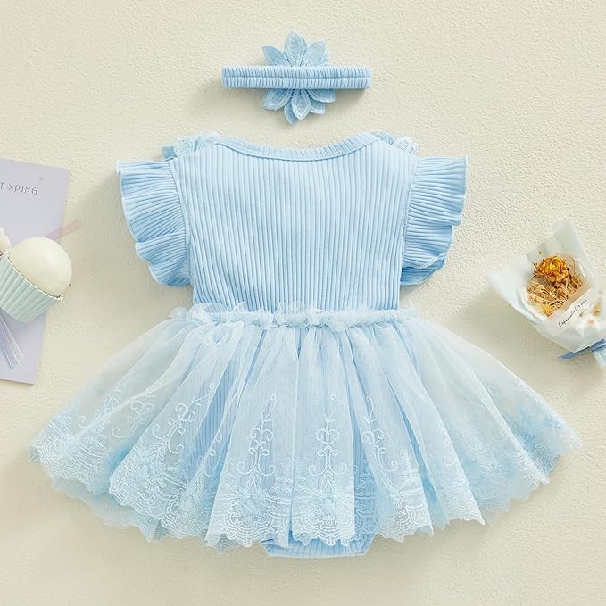Infant Baby Girl Lace Romper Baby Tulle Dress Romper Flowers Bodysuit Spring Summer Festival Clothes with Headband