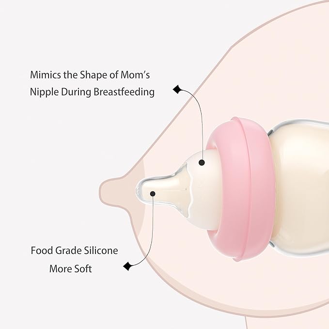 • Silicone Nipple: The nipple is made of food-grade silicone and is super soft, allowing babies to suck naturally. The bottom of the nipple has intelligent pressure regulating valve, balance internal and external pressure, milk and air separation, to avoid the baby breathing too much air caused by colic flatulence.