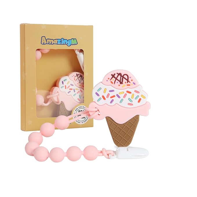 Baby Food Grade Silicone Teether Toy with One Piece Design Pacifier Clip Holder,Teething Toys Gift Set for 3 Months+ Boys and Girls,Freezer Safe,BPA Free. (Ice Cream)