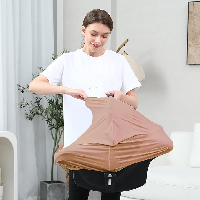 • BREATHABLE & STRETCHY FABRIC: Our car seat cover made of buttery soft, breathable and stretchy premium quality fabric that is specially designed to provide maximum airflow (top have a open hole). It's doesn't need any zippers / snaps to fixed on the carseat, it's very easy to use. 27.45 * 25.39 inches size provides full coverage and enough space while nursing. Create a cooling, soft and quite environment for your baby.