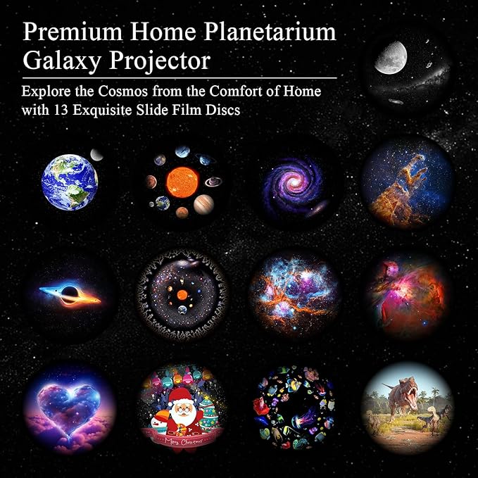 • Immersive Galactic Experience with SOMKTN Premium Home Planetarium Star Projector: Transform any space into a mesmerizing celestial wonderland with our realistic planetarium projector. Perfect for the bedroom, this cosmic space projector offers an immersive experience for kids and adults alike. Featuring 13 4K HD φ18mm large pattern film discs, our planet projector ensures stunningly realistic depictions of stars, planets, and galaxies, bringing the cosmos right into your home.
