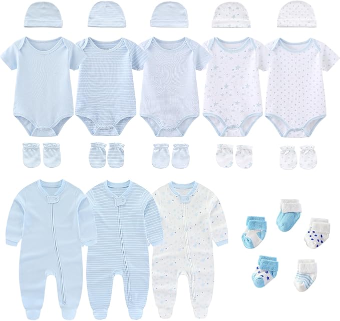 • Package: 5pcs short-sleeved bodysuit, 3pcs 2-way zip romper, newborn essential accessories set. Essential accessory set: 5-piece hats, mittens and socks set