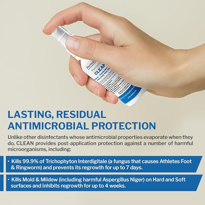 • UNIQUELY VERSATILE. More than just a one-step “Spray & Walk Away” disinfectant, sanitizer, cleaner and deodorizer, CLEAN is also a potent Pet Stain & Odor Eliminator; Mold & Mildew Remover that halts regrowth for weeks; approved for antimicrobial control and odor removal in HVAC Systems; and more.