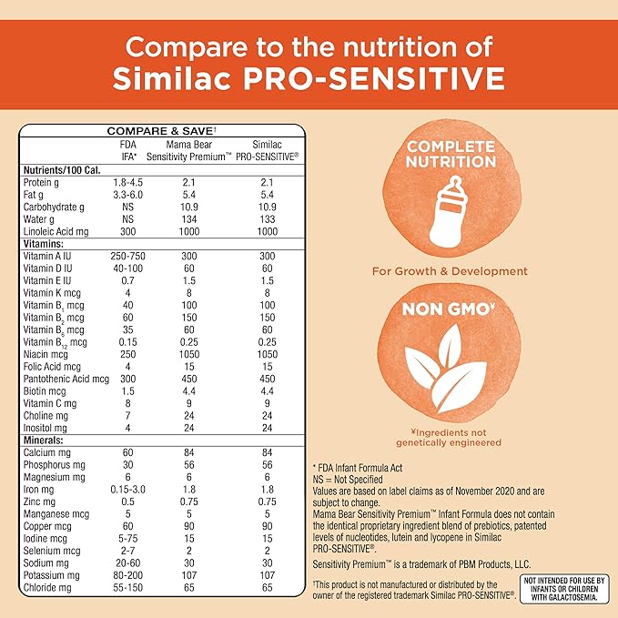• COMPLETE NUTRITION: Mama Bear Sensitivity Premium provides complete nutrition for baby's first year; this enhanced formula has multi HMOs versus our single HMO formulation; compare to the nutrition of Similac Pro-Sensitive