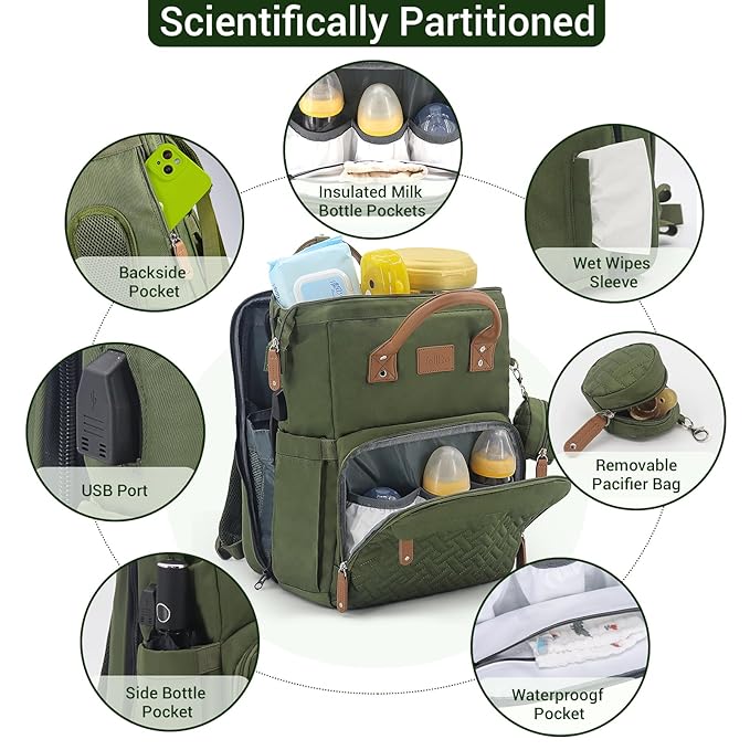 • 【Large Capacity Multifunction】 Our Diaper Bag Backpack is designed with 16 pockets, scientifically partitioned to hold all essential items such as diapers, creams, wipes, and more. It also features 3 insulated pockets for bottles, keeping them warm or cool as needed. With its generous capacity, this backpack can even accommodate a laptop or breast pump. Soft Changing Pad:makes a baby comfortable while changing.