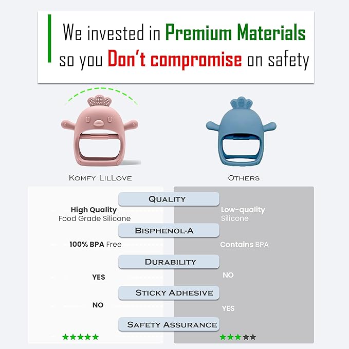 • Safe Material One-Piece Design: Made from food-grade silicone, our silicone teethers for babies are BPA-free, non-toxic, and completely safe for babies. The one-piece construction means no small parts or choking hazards, just simple, worry-free teething relief that parents can trust.