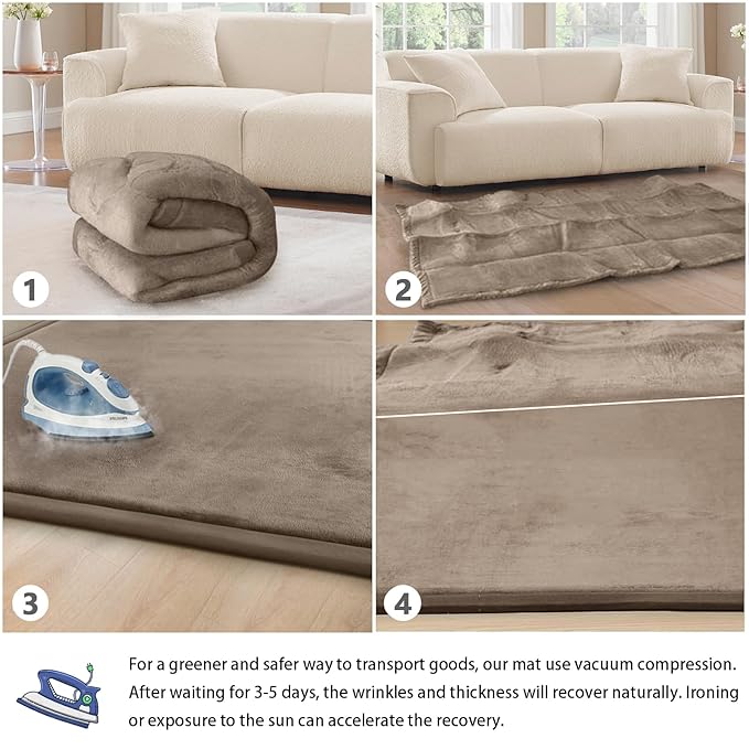 • 🌟HOW TO CARE FOR YOUR MAT:When you open the package,it may be wrinkled,very flat and inelastic.Don't fret - this is normal! As long as it is left for 3-5 days, the mat will naturally regain its thickness and elasticity. we recommend steaming or ironing it to speed up recovery. After you have completed the steaming/ironing, your thick floor padded mat should rebound and be ready to use!
