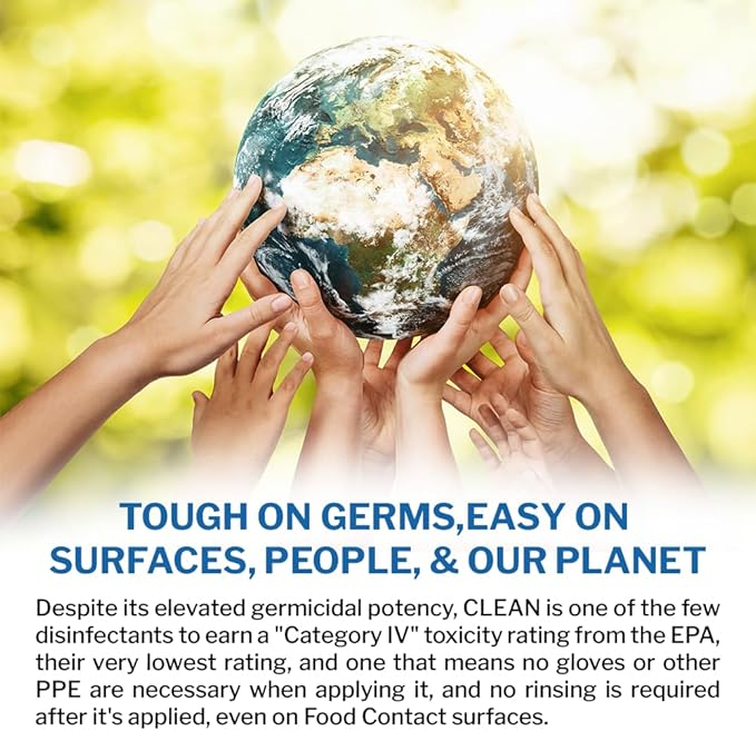 • LOWEST TOXICITY RATING OF ANY DISINFECTANT. CLEAN is one of the few disinfectants to earn an EPA “Category IV” toxicity rating, their very lowest, meaning no gloves or other PPE are needed when using it, and no Hazard Warnings are required on its labels.