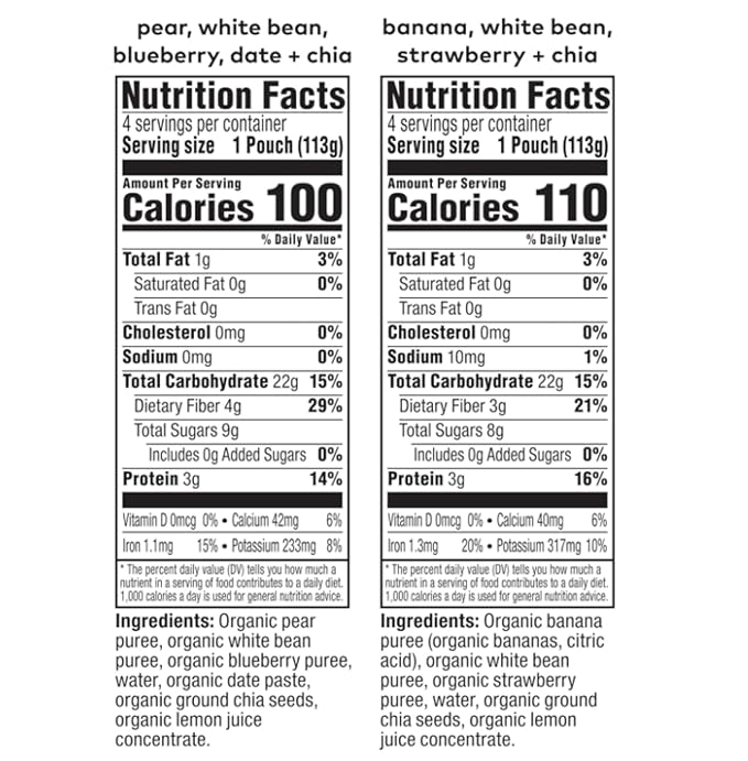 • MADE WITH NATURAL FLAVORS: Pear, White Bean, Blueberry, Date, and Chia and Banana, White Bean, Strawberry, and Chia blends made with organic purees
