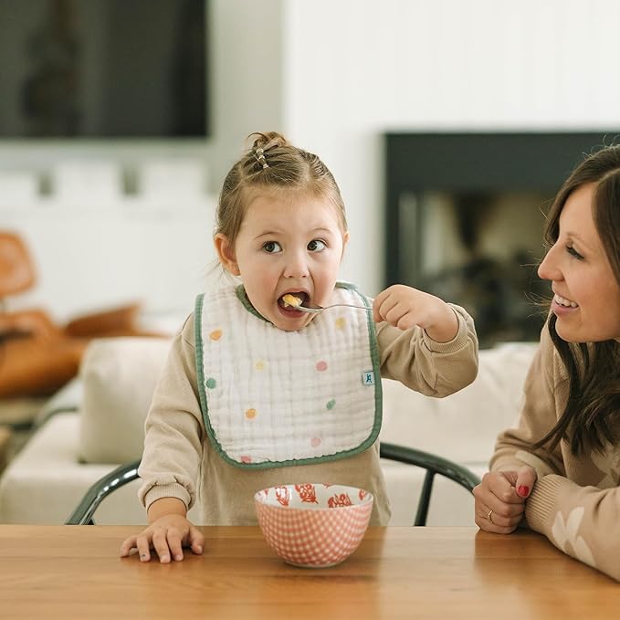 • MEALTIME DROOL CATCHER: We make our bibs with 3 layers of highly absorbent, 100% cotton muslin. The thickness of these layers helps soak up Baby’s drooling and absorb spills, while keeping food off the baby during breakfast, lunch, and dinner.